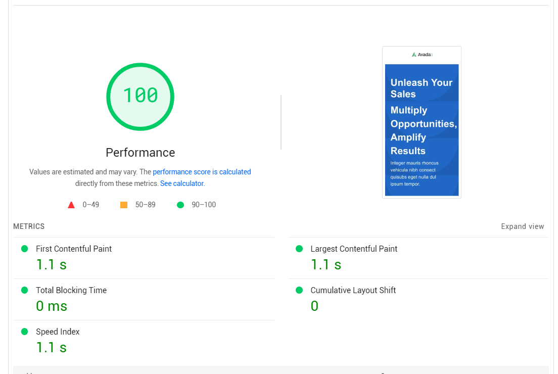 There we go! A great score for Avada, and a nice responsive site that that feels speedy for users. You can check it out for yourself here: https://avada.speedifypress.com/