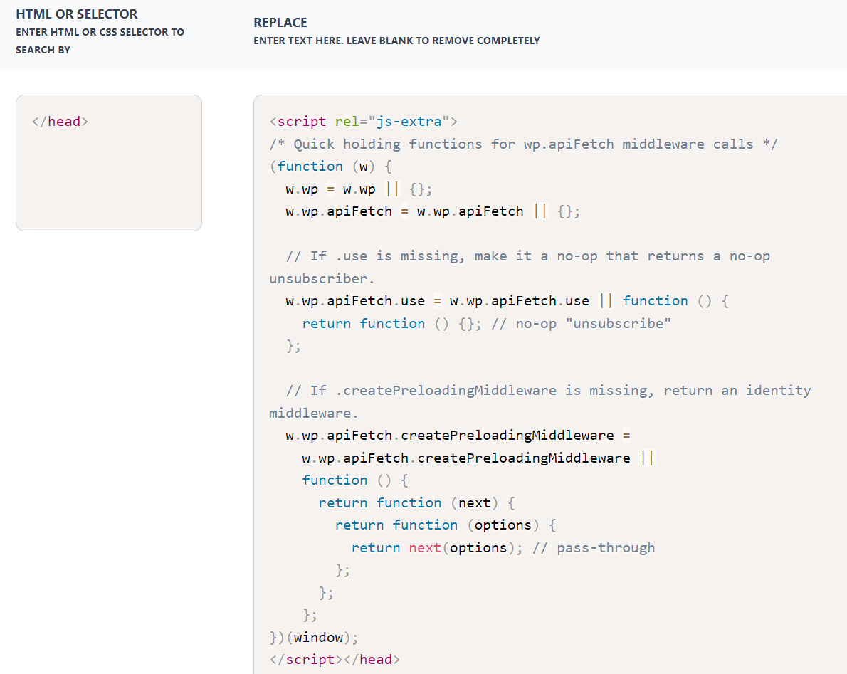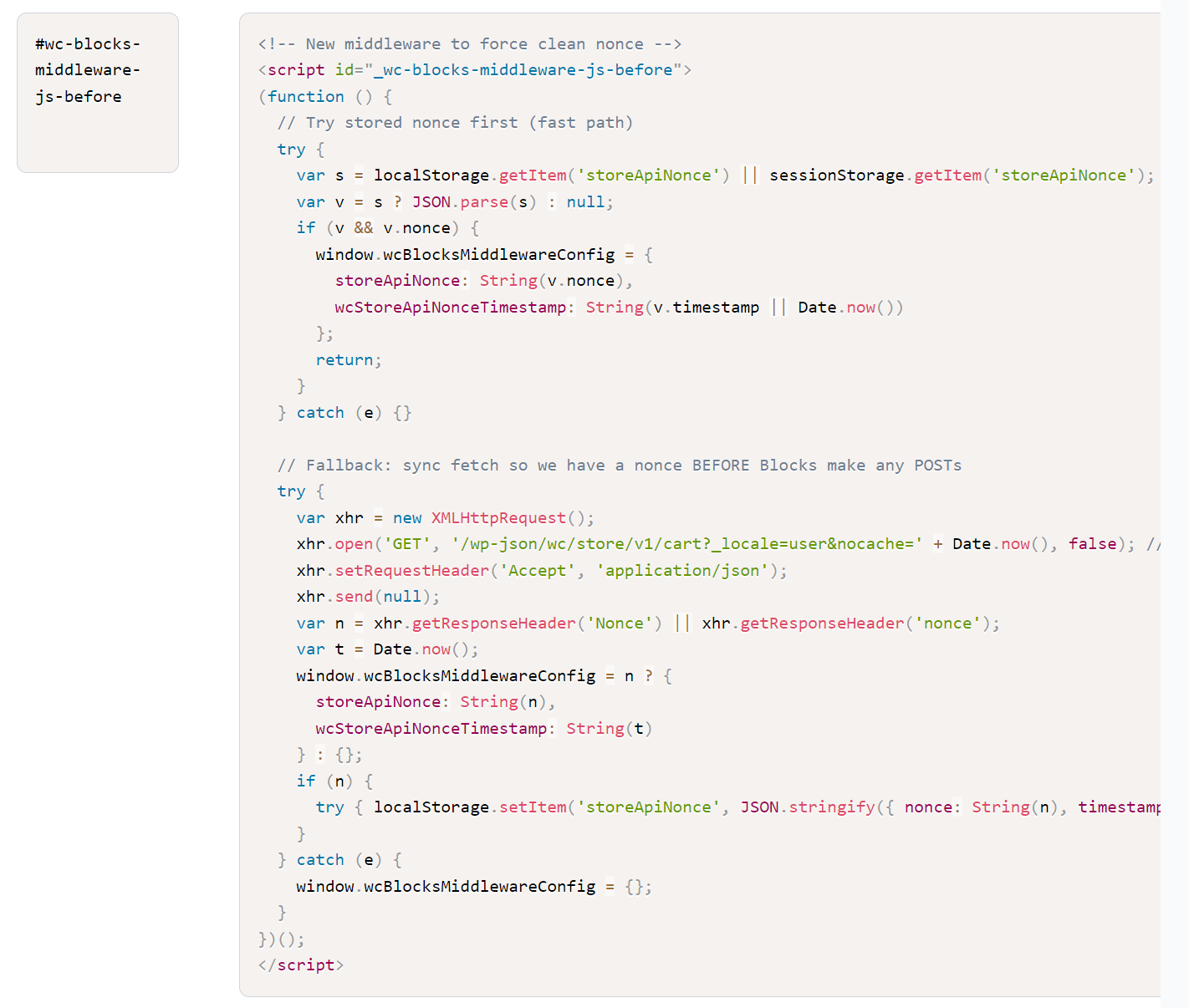 To fix, we can’t just remove the wcSettings object, which I did try initially (using Find/Replace). Instead, we can define the object early so the settings are available BUT the wp.apiFetch won’t run to bring in the hardcoded settings.
