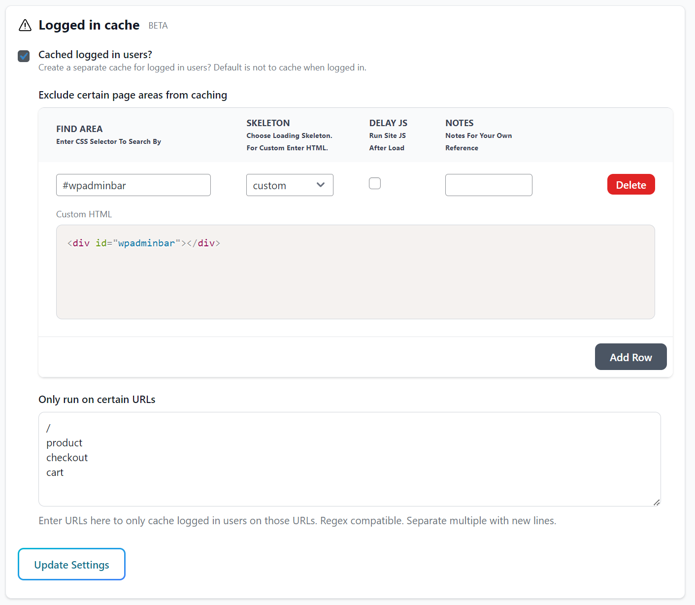 So, I’ll only cache logged in users on the homepage, product pages, cart and checkout. And I’ll exclude the WP Admin bar from being cached so admin users won’t see each others admin bars. Note the cache creates separate caches per user role (so users and admins are never mixed).