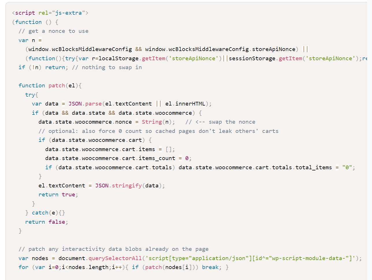 What’s happening here? Well the checkout stores the nonce hardcoded onto the page in the wcBlocksMiddlewareConfig variable. This means when we cache for logged-in users, two different customers would be given the same nonce.